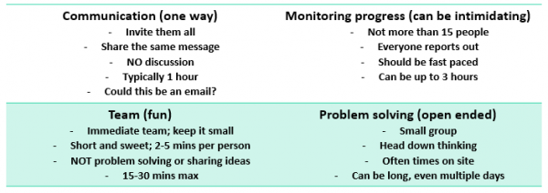 Let’s start with assuming that there are four types of meetings. Full disclosure, this varies from resource to resource, but we chose these four because we felt like they fit with our team needs. It helps to define the meeting for team members because then they know what to expect and what expectations are for their participation.